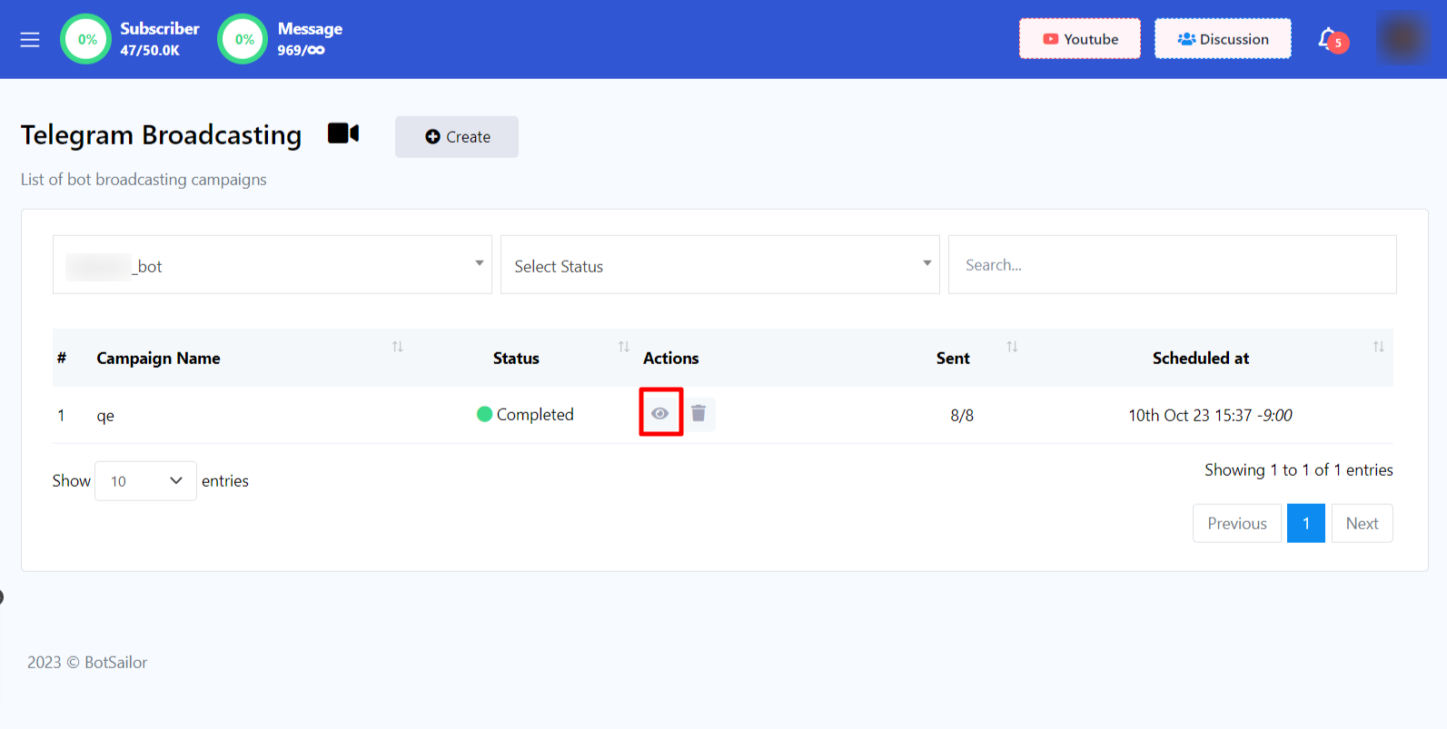 - Select a bot to send broadcast message from dropdown menu.